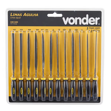 Conteúdo da Embalagem: 1 Jogo com 12 peças com cabo, sendo: 1 chata paralela bastarda, 1 chata paralela murça, 1 chata bastarda afilada, 1 chata murça afilada, 1 faca murça afilada, 1 meia-cana murça afilada, 1 triangular murça afilada, 1 redonda murça afilada, 1 oval murça afilada, 1 quadrada murça afilada, 1 amêndoa murça afilada e 1 barrete murça afilada.
